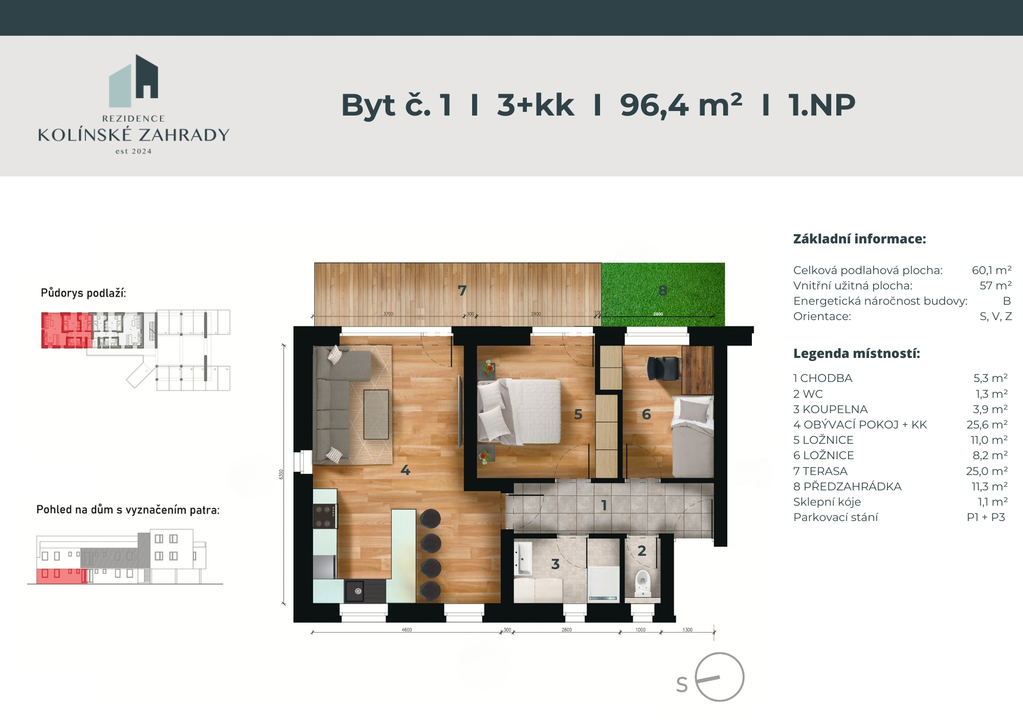 Tento byt 3+kk ve přízemí novostavby o celkové velikosti 92,8 m² se skládá ze dvou ložnic, prostorného obývacího pokoje s kuchyní, chodby, koupelny, samostatné toalety, terasy a předzahrádky.